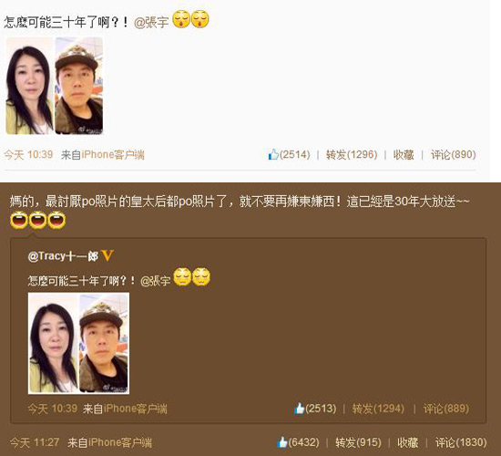 5日是兩人戀愛30年的紀(jì)念日,蕭十一郎在微博分享了二人的“合照”,相似表情和角度很逗趣。她說:“怎么可能三十年了?!”張宇隨后也轉(zhuǎn)發(fā)妻子的微博,驚訝的說,“最討厭po照片的皇太后(指蕭十一郎)都po照片了,就不要再嫌?xùn)|嫌西!這已經(jīng)是30年大放送”,稱老婆為“皇太后”。盡管網(wǎng)友笑稱是“妻管嚴(yán)”,但也在微博發(fā)起“有一種愛情叫張宇十一郎”話題,紛紛表示祝福。(中國臺灣網(wǎng) 何建峰)