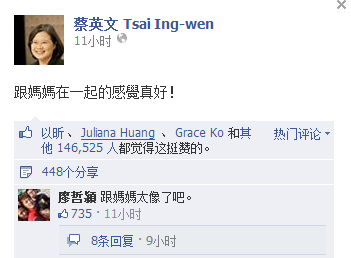 蔡英文臉書人氣依舊,母親節(jié)合照有14萬多名網(wǎng)友按贊關(guān)注。馬英九前天所刊出的《慈母良師一甲子,永世難報養(yǎng)育恩─悼亡母厚修女士》一文,也有近17萬網(wǎng)友按贊。(中國臺灣網(wǎng) 周劍)
