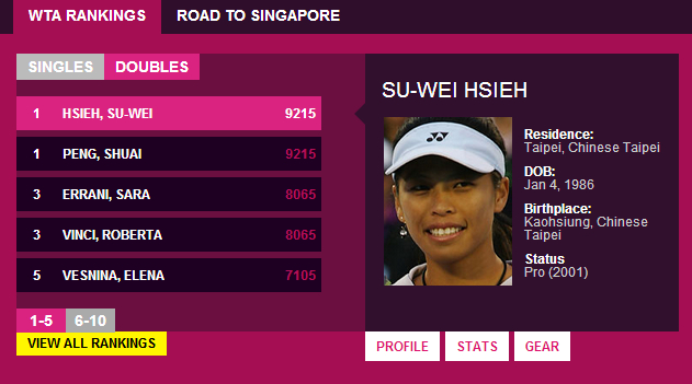 彭帥和謝淑薇雙打積分都是9215分,并列世界第一,WTA官網(wǎng)也放上謝淑薇的照片。(圖片來自WTA官網(wǎng))
