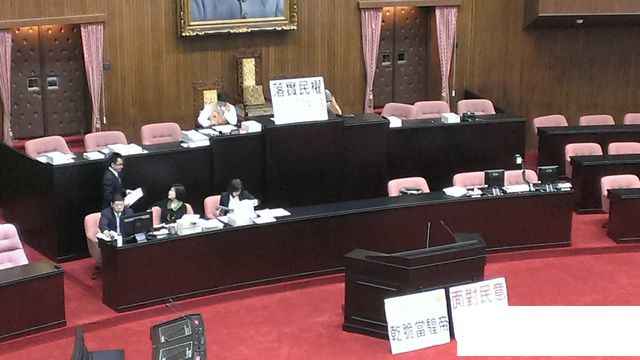 臺(tái)聯(lián)黨團(tuán)在主席臺(tái)擺出“反對(duì)調(diào)高‘罷免’門坎”標(biāo)語(yǔ),發(fā)言臺(tái)前方放置“面對(duì)民意,可割可棄”、“民意當(dāng)空氣,干脆當(dāng)騜帝”標(biāo)語(yǔ)。