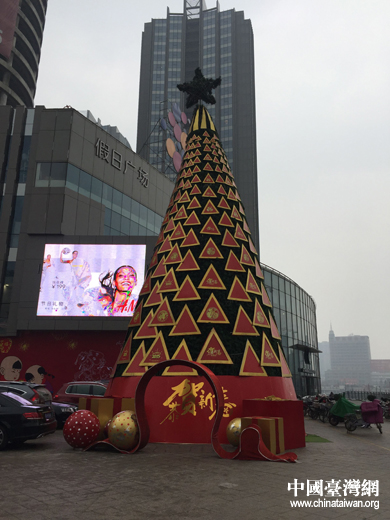 2月15日,濰坊小雨,商場前高大的春節(jié)擺設,讓車來車往的大街上多了一抹紅色的喜慶。(中國臺灣網 張玲 攝)
