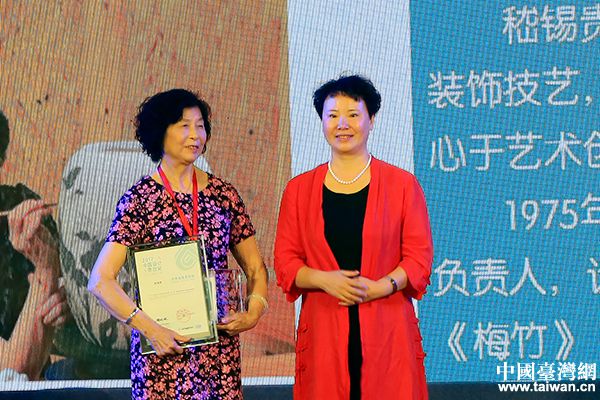 浙江聯(lián)合中小企業(yè)控股集團董事長周穎為入圍獎獲獎者黃強頒獎,獲獎作品為《奇石方磚套壺》。(中國臺灣網(wǎng) 盧佳靜 攝)