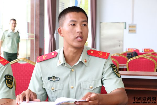 和平中隊(duì)三班副班長(zhǎng)王元向記者講述強(qiáng)軍故事。(中國(guó)臺(tái)灣網(wǎng) 尹賽楠 攝)