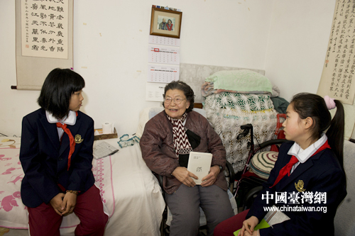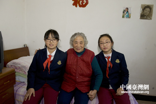 梁淑琴老人的女兒在國(guó)外定居,她說看到了孩子們就想起了自己的外孫女,要和兩個(gè)“外孫女”合個(gè)影。 (中國(guó)臺(tái)灣網(wǎng)發(fā) 尹珺攝)