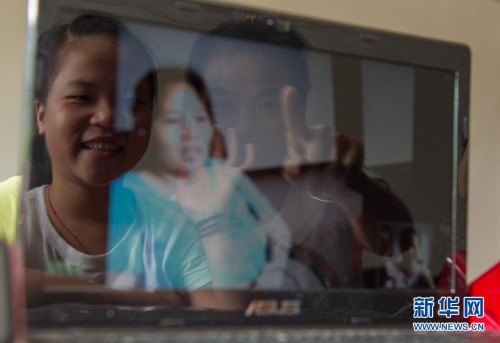 8月20日,在巴南區(qū)南彭街道將軍灣村,留守兒童楊渝(左)在大學生村官汪瓊的幫助下和母親視頻聊天。當日,重慶市巴南區(qū)200多名大學生村官來到結對幫扶的留守兒童家中為他們補習功課,讓他們和在外地的家長視頻聊天,并為孩子們進行心理輔導。本次活動還專門為留守兒童準備了一堂“收心”課,幫助孩子們提前適應新學期的到來。新華社記者陳誠 攝