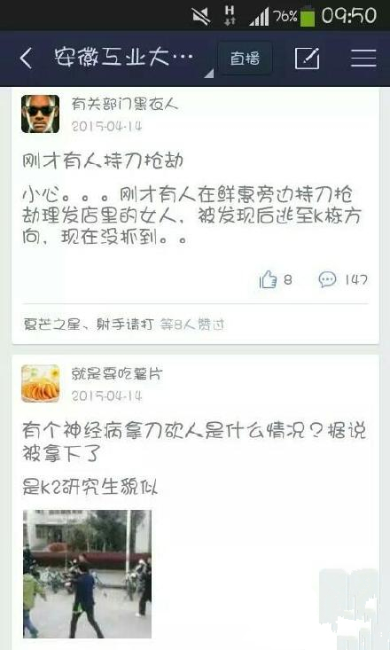 據(jù)多位安徽工業(yè)大學(xué)同學(xué)爆料:今早9時(shí)許,安工大東校區(qū)一學(xué)生突發(fā)神經(jīng)病,先砍車后砍人。隨后學(xué)校輔導(dǎo)員第一時(shí)間向?qū)W校內(nèi)同學(xué)發(fā)布安全注意事項(xiàng),據(jù)了解,突發(fā)精神疾患的學(xué)生還劫持了一名理發(fā)店內(nèi)的女生,隨后有大批警力趕到現(xiàn)場(chǎng)進(jìn)行處理。