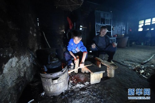 在廣西龍勝各族自治縣東升村秧地村民小組,9歲的陽董超和爺爺一起在廚房燒水(2015年5月5日攝)。