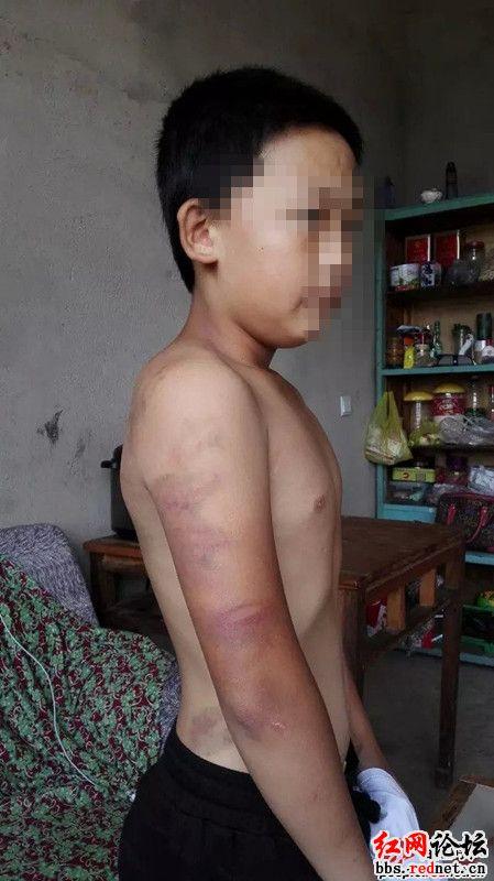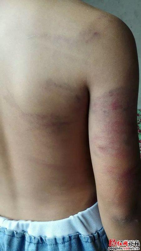 2015年6月12日晚,上小學(xué)五年級的小豪(化名)很晚才回家。回家后沒吃晚飯就睡下了。第二天早上,叫孩子吃早飯的奶奶和姑姑發(fā)現(xiàn)11歲的小豪“全身多處淤青,簡直就是遍體鱗傷”。在姑姑的追問下,小豪說出了自己身上的傷是被四年級的譚老師打的。在紅網(wǎng)論壇的圖片中,孩子全身多處淤青紅腫,有的地方還被打破了皮。