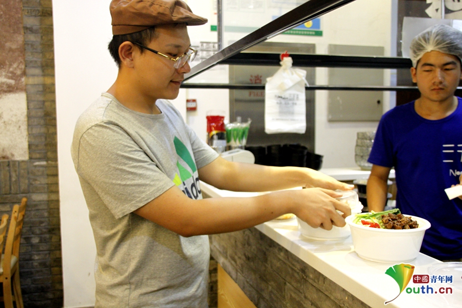 準(zhǔn)備食材、切配、為午飯高峰做準(zhǔn)備,飯點(diǎn)過后添置原材料,晚上打掃整理打烊。面館開業(yè)頭四個(gè)月里三人每天只能睡三個(gè)小時(shí),正是在大家的共同努力下,小店第一個(gè)月的收入高達(dá)30萬元。中國青年網(wǎng)記者 王婧 攝