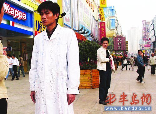 24日下午,在青島臺(tái)東三路步行街上,一名身穿白色大褂,前后寫著“本人出租”字樣的小伙站在街頭,吸引了眾多市民的眼球。據(jù)了解,這名小伙之所以愿出租自己的身體,為商家做“活”的廣告牌,是為了籌錢尋找失散的妹妹。市民對(duì)此卻褒貶不一。