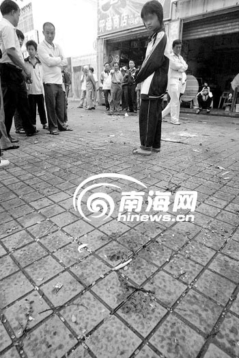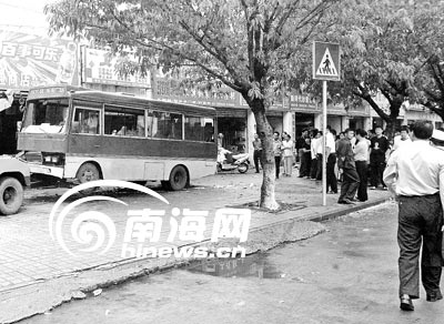 10月31日中午12時(shí)10分左右,海口公交8路中巴車,行駛到白龍南路?诘4中學(xué)公交車站時(shí),突然沖向在公交站臺(tái)等車的人群,將正在等車的3名學(xué)生撞倒,失控中巴拖著兩名學(xué)生沖過綠化帶和非機(jī)動(dòng)車道,撞墻后才停在了人行道上,事故造成3名學(xué)生1死兩傷。