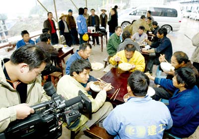 渝北區(qū)某工地,攝制組鏡頭對準(zhǔn)了正準(zhǔn)備吃午飯的民工 記者 龍在全 攝