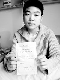 “我不想死,我要做給爸爸媽媽看,沒有他們我照樣活,而且活得比他們還好。”12月24日,本報(bào)接到小雙郵自北京世紀(jì)壇醫(yī)院的來信。昨天,在世紀(jì)壇醫(yī)院的病房里,小雙正捧著書看得入神,當(dāng)他抬起頭時(shí),記者看到一張花季少年的臉,但這張臉卻是毫無血色的蒼白。