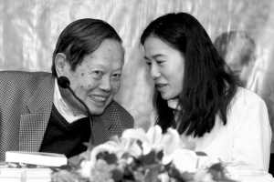 翁帆為楊振寧重復(fù)讀者、媒體的問題。本報(bào)記者 蒲東峰 攝
