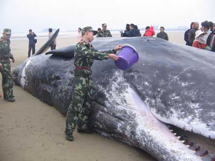 昨日上午,記者在現(xiàn)場看到,鯨魚的頭頂埋在沙中,一米多長的嘴巴張開著,口中血跡斑斑,好多牙齒已經(jīng)掉了,身上還有幾處傷口,F(xiàn)場的漁業(yè)專家說,這頭鯨魚是抹香鯨,屬于國家二級保護動物。經(jīng)測量,該鯨魚長16.08米、腰圍8.6米,重約20噸。