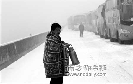 一名男子頭上披著一床紅色的毛毯,胸前掛著一床棉被,手上拎著一個熱水瓶,一步一滑,在結(jié)冰的京珠高速路上艱難行走著。