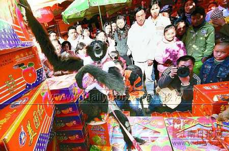年貨購好后,“叮!蹦弥呀(jīng)屬于自己的香蕉啃了起來,時而很高興,時而又發(fā)出好像很難吃的聲音,把圍觀的人都逗笑了。為了讓“叮叮”和小猴子當(dāng)一回真正的“購物狂”,云南野生動物園副總經(jīng)理丁燁鋒決定再帶它們?nèi)サ浇瘃R碧雞坊給市民拜早年!岸6!焙托『镒庸涞搅四掀敛叫薪值哪曦浗,買了糖和帶“福”字的中國結(jié)!按汗(jié)馬上就要到來,為了給小動物過春節(jié),特意讓小動物們自己到年貨街辦年貨,挑選喜愛的食物。