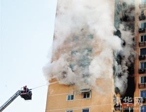 昨天上午8點,記者看到,事發(fā)小區(qū)門口已拉上警戒線。大量消防車、警車及120急救車停在門口。12號樓14層西側(cè)的幾個窗口處還在不斷向外冒著濃煙,并有玻璃碎片從樓上掉落。消防員站在高架云梯上用水槍撲滅余火。