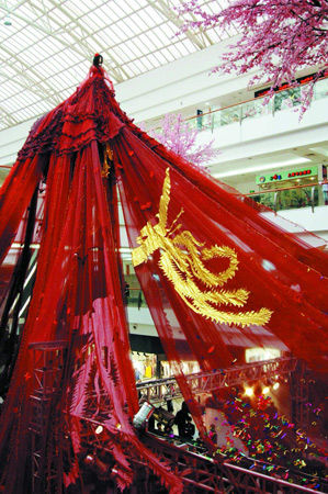 為了追趕奧運(yùn)風(fēng),商家可謂費(fèi)盡心思。昨天,一款長達(dá)999米、帶有濃濃奧運(yùn)色彩的中國紅婚紗亮相天興·羅斯福中央大堂。這是由大連婚慶協(xié)會籌委會舉辦的今年婚慶流行趨勢現(xiàn)場展示活動之一。