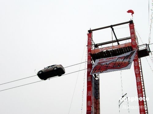 中新社平江四月二十七日電(記者 鄧霞)被稱為“中國車王”的河南漢子劉鎖柱,今日在湖南平江駕駛著一輛未經(jīng)改裝的普通小汽車,在距汨羅江四十五米的高空上,沿著兩根鋼絲鋪成的“天路”成功行駛了二百三十米。據(jù)介紹,這個距離目前為“中國之最”。