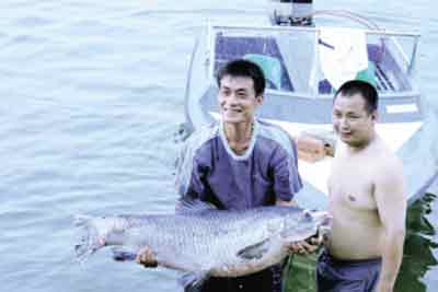 靈山農(nóng)民捕獲“黑鯇王”,村民笑開顏。記者 唐海波/攝