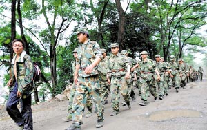 接到上級(jí)命令后,映秀鎮(zhèn)附近的官兵在簡(jiǎn)單帶了點(diǎn)干糧后立即撲向大山搜救失事直升機(jī)。新華社發(fā)