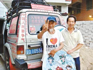 記者在廣州中大北門后面的一個(gè)小旅館見到了張汝侯、張光澤父子和他們貼滿奧運(yùn)宣傳標(biāo)語的越野車。張汝侯老人1919年出生,白族人,走路有點(diǎn)顫抖,很難相信他坐車行了31個(gè)省市自治區(qū)、341個(gè)市、2000多個(gè)縣。