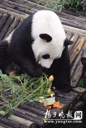另一個(gè)蛋糕的設(shè)計(jì)者是8歲的女孩姚雪。她告訴記者,聽(tīng)說(shuō)美靈過(guò)生日,她在家里跟家人策劃出一個(gè)“竹子花”來(lái),就是用雜糧饅頭把竹子一端封口,再把蘋果、胡蘿卜打成果泥,灌到竹子里。可是她到動(dòng)物園一看,原來(lái)熊貓寶寶們吃的竹子很細(xì),根本沒(méi)法灌果泥。于是她在家人的幫助下,也用帶葉的竹子為主材料,編出一只“鳥(niǎo)巢蛋糕”來(lái),“鳥(niǎo)巢”里則放著蘋果,再點(diǎn)綴上胡蘿卜片,這樣一來(lái),綠色和橙色相配,倒也蠻好看的。