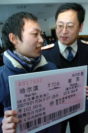 圖片資料:2007年1月19日,哈爾濱火車站副站長武中凱(右)在捐贈(zèng)儀式上贈(zèng)給大學(xué)生賈紅巖車票。哈爾濱火車站從2006年開始,在全站職工中開展捐贈(zèng)活動(dòng),并用捐贈(zèng)款購買車票送給那些家庭生活困難的學(xué)生在假期返回家中。 (新華社記者崔峰攝)