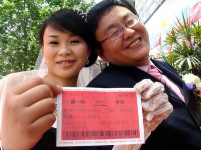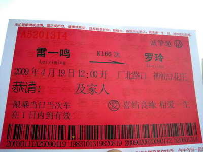 核心提示:19日中午,成都某酒樓一場特殊的儀式開始了。奇怪的是,前來的嘉賓人人手里拿著一張火車票。據(jù)記者了解,原來這可不是普通的火車票,而是新郎雷一鳴為婚禮專門設(shè)計(jì)制作的請(qǐng)柬。