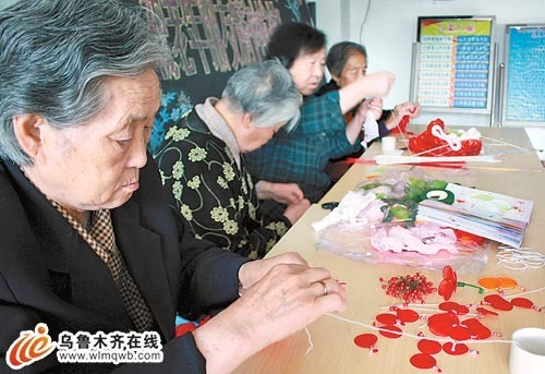 6月16日,烏魯木齊市養(yǎng)老福利院老人在學(xué)習(xí)扎花。該公寓內(nèi)150張床位已經(jīng)住滿,床位緊缺現(xiàn)象從去年年初開始一直持續(xù)到現(xiàn)在。
