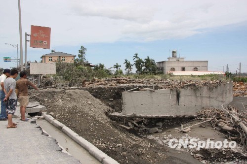 “莫拉克”臺風(fēng)重創(chuàng)臺灣,重災(zāi)區(qū)之一的臺東太麻里鄉(xiāng)有數(shù)個住戶被洪水沖走,平日的道路變成了河床。圖為8月10日,幾名當(dāng)?shù)鼐用駚淼浆F(xiàn)場,講述一夕間的巨變。 中新社發(fā) 董會峰 攝