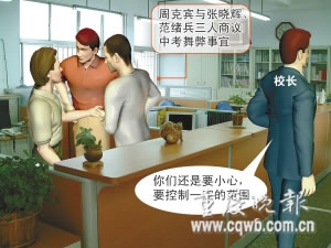 6月11日上午,中考前夕,27歲的周克賓與張曉輝、范緒兵三人商議中考相關(guān)事宜。商量過(guò)程中,周克賓提出可以抓住一些機(jī)會(huì)為學(xué)校做一點(diǎn)事情,即尋找機(jī)會(huì)舞弊。他雖未明說(shuō),但其他兩人都心知肚明,表示了贊成。