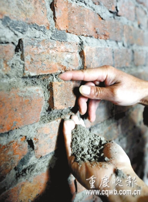 用手一抹,磚塊間就掉沙灰。