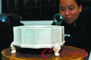 昨日下午,得到藏家羅先生特許,本報(bào)記者按要求獨(dú)家拍攝了這件汝窯,并探尋了其中三大傳奇之處,“目前來(lái)說(shuō)因?yàn)槭枪缕罚瑸榱朔乐狗略,我們禁止任何拍攝,廣州日?qǐng)?bào)拍攝的圖片,是第一張。”潘館長(zhǎng)說(shuō)道。