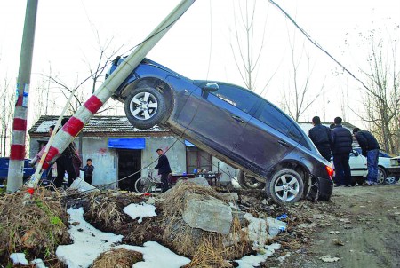 11月22日16時許,山東省巨野縣職業(yè)教育中心北50米拐角處,一輛小轎車爬上了線桿的斜拉線。據(jù)附近居民介紹,當(dāng)時轎車準(zhǔn)備自西向南轉(zhuǎn)向,因避讓逆向駛來的車輛而出現(xiàn)了意外,先是撞斷了一根線桿,緊接著爬上了另一根線桿的斜拉線。(黃體軍 楊斌 閆成帥 攝影報道)