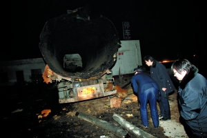 爆炸的罐車為河北牌照,車頭已被炸扁,密封的罐身已被炸得前后貫通,車前的墻壁被爆炸產(chǎn)生的氣浪沖倒。并排停在爆炸罐車后面10米遠(yuǎn)的、分別掛有山東和江蘇牌照的兩輛罐車,車頭均部分損毀,罐身上“危險(xiǎn)品”、“易燃易爆品”字跡仍清晰可見。