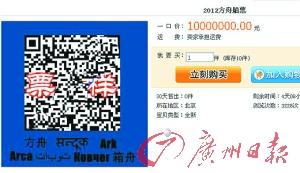 淘寶上,有賣“方舟船票”的,有賣“方舟直達解放牌貨車車票”的,有用谷歌地圖追尋方舟在地球上的停靠點的。一名網(wǎng)友1000萬元叫賣“方舟船票”最為火熱,不少網(wǎng)友回帖詢問能否打折、如何鑒別真?zhèn),還有詢問有否包含災(zāi)難后重建送指定城市戶口。