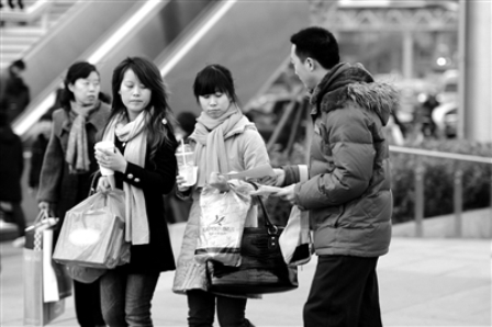小偉向途經(jīng)此地的一些女孩發(fā)放特殊“尋人啟事”。本報(bào)記者 王磊 攝
