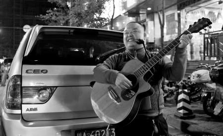 晚上7點(diǎn)剛過,一輛雙環(huán)越野停在鼓樓北二街某火鍋店門前,一位身材敦實(shí)的中年男子從車?yán)镒叱鰜,從尾廂中拿出一把木吉他、一個(gè)黑色音響,熟練地調(diào)音、插電、戴上話筒。10秒鐘后,他提著音響走進(jìn)火鍋店,開始了一天的賣唱工作。他叫羅威,今年42歲,重慶人,被人親切地叫作“胖哥”。