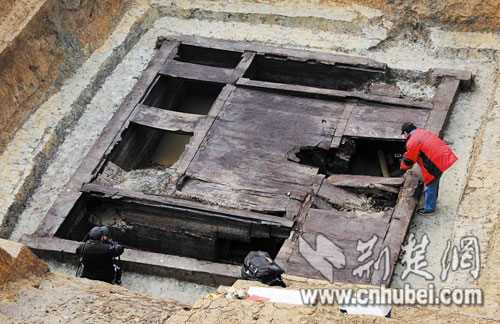 昨日(17日),備受矚目的(湖北)嚴倉古墓群主墓葬槨蓋完全揭開,令人惋惜的是各墓室均已遭嚴重損毀,更令人吃驚的是,墓室內(nèi)居然留下一只現(xiàn)代黑色橡膠桶,疑為現(xiàn)代盜墓賊所為。