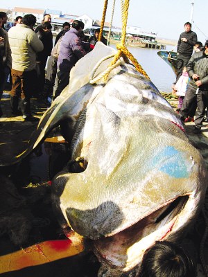 船主徐師傅告訴記者,這條大魚于1月16日那天,在離海邊約200海里的黃海海域捕獲到的,當時它已經(jīng)被事先布置的流網(wǎng)纏了兩三天,被發(fā)現(xiàn)的時候,已經(jīng)精疲力竭了。據(jù)射陽縣海洋漁業(yè)局漁業(yè)專家介紹,這條鯊魚屬于蒙鯊,又叫姥鮫和贛鯊,其體形巨大, 僅次于鯨鯊。從理論上講,在我國東海黃海可見,數(shù)量有限,眼下處于寒冷季節(jié)里,在高緯度黃海海域里捕到這樣的魚更是罕見。