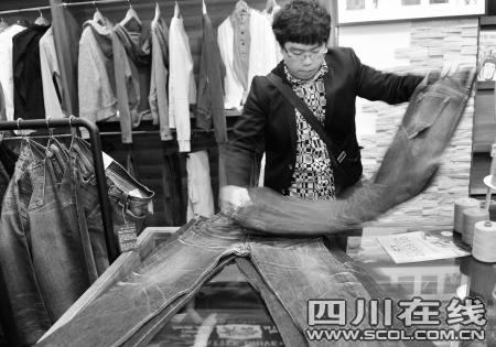 前日下午,“養(yǎng)牛人”之一的“豪豬”穿著一條已經(jīng)“養(yǎng)”了兩年的牛仔褲從北京回到成都。作為成都“養(yǎng)!钡南闰(qū)者,27歲的他已經(jīng)“養(yǎng)!3年,現(xiàn)在手中有7條“牛”。說(shuō)起自己的“!,“豪豬”立即搬出了4條牛仔褲!斑@條是‘養(yǎng)了’3個(gè)月的,這條半年。”豪豬說(shuō),“接下來(lái)這條一年,最后就是兩年的!焙镭i拿起“養(yǎng)”了一年的褲子,褲子后袋部位上一個(gè)T字形十分明顯。這個(gè)是他在其他牛友的啟迪下,將一個(gè)小方盒裝在后袋內(nèi)一個(gè)月磨出來(lái)的。“還能塞貓爪形狀的玩具,花紋酷酷的ZIPPO打火機(jī),很Q吧?”