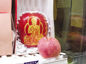昨天,記者來到該百貨店內(nèi)的水果區(qū)看到,這個標(biāo)價8800元的蘋果,大小與一個排球差不多,色澤鮮紅油亮,重約1.5公斤,用獨(dú)立紙盒包裝,蘋果上面“長著”金色的釋迦如來像,花紋細(xì)致精美。標(biāo)簽顯示,這個“天價蘋果”出身“顯赫”,是“日本特級富士”,是從日本最著名的蘋果產(chǎn)地——青森縣空運(yùn)過來的。據(jù)店方介紹,像這種“8800元”一個的蘋果在培育期間,一棵樹上一般只讓結(jié)兩個蘋果,其余不符合標(biāo)準(zhǔn)的蘋果會被果農(nóng)摘除掉。更加費(fèi)力的是,每個蘋果在剛結(jié)出的時候就開始貼膜,要經(jīng)過一百次以上的換膜,才能得到蘋果上各種精美的圖案。日本“特級富士”有一個其它蘋果都沒有的最大優(yōu)點(diǎn),就是它在常溫下可以保存半年,切開后,半個月才會出現(xiàn)氧化現(xiàn)象。