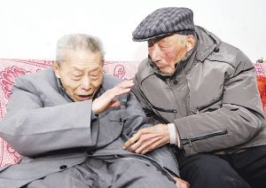 編者按:101歲的朱文國(右)欠身向端坐沙發(fā)上99歲的“小舅舅”拜年問好。這二老的關(guān)系可沒搞錯,雖說吳東是舅舅,但確確實實比親外甥朱文國小兩歲,舅甥關(guān)系一點都不含糊!鄙祥T拜年說起來容易,對百歲高齡行動不便的老人可是一件大難事,朱老在揚州的子女都上了年紀,年齡稍小的子女、孫子又在外地。