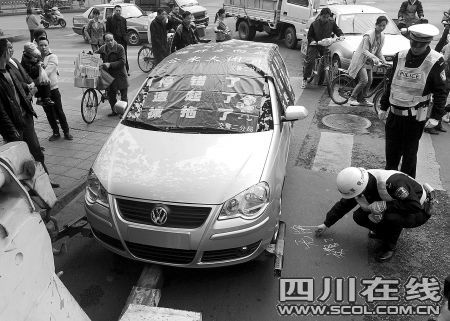 “停錯了!遭起了!被拖了!”14日上午,在成都太升南路兒童醫(yī)院旁,一輛亂停亂放的標致307被交警罩上了一件特殊的“外衣”,“外衣”上醒目的幾行字,引起了不少市民駐足圍觀。面對如此“雷人”的外衣,市民褒貶不一。