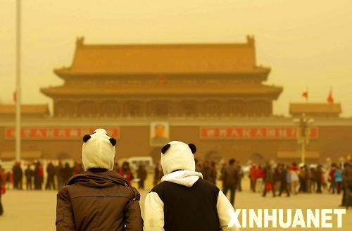 3月20日,兩名男子冒著浮塵游覽天安門廣場。當日,強沙塵天氣突襲北京,天空昏黃,能見度低。新華社記者 周磊攝
