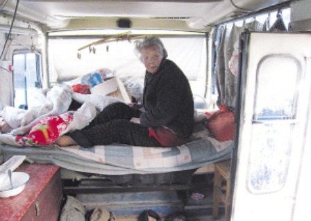 老人見記者來訪,從車內(nèi)的床上探起身來。
