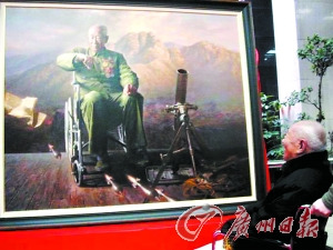 老英雄望著畫家為其所作的油畫笑得合不攏嘴。