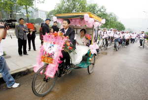 “在車隊組織的一次騎行中,我們成功戀愛了。”“巴豆”說,自己與新娘因自行車結(jié)緣,所以辦一場自行車婚禮,是他一直的夢想,也想以這樣的特殊方式,送給同樣是80后的新娘一個“低碳”婚禮。